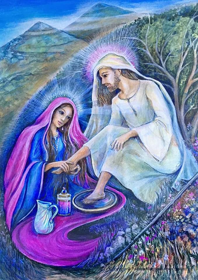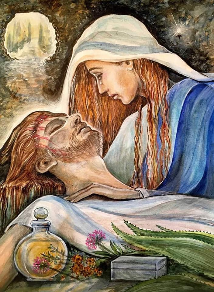 A kanonikus evangéliumokban Mária Magdolna egyik kulcsjelenete az, amikor megkeni Jézus lábát a drága szikes olajjal. A “Krisztus” szó, szó szerint azt jelenti, hogy “a felkent”, de a felkenés nem volt zsidó szokás. A tüskésbogyó-olajjal való megkenés az ősi pogány rituálé, a hieros gamos, vagyis a szent házasság része volt. A fej, a lábak és a nemi szervek megkenése “része volt a rituális előkészületnek a behatolásra a rítus során … amelyben a papkirályt elárasztotta az isten ereje, míg a papnő-királynőt a nagy istennő szállta meg”.